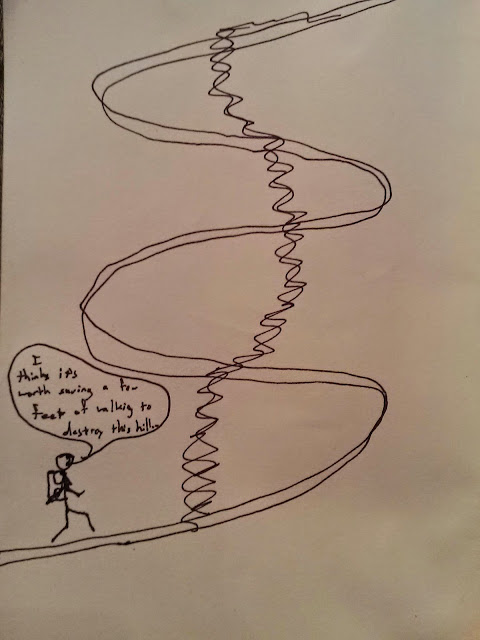 Climbers want to exude the persona of being environmentally friendly, and good stewards of the areas they use. Frequently we do a good job, picking up other's trash or carpooling to the crag maybe. But one thing we continue to get wrong is the trails we make and use. Climbers take a perverse pleasure in "climbers trails" - which means just walking in a straight line to whatever objective there is. This creates long-lasting erosion problems and terrible trails full of debris. So next time, use the switchback, and save the hillside.